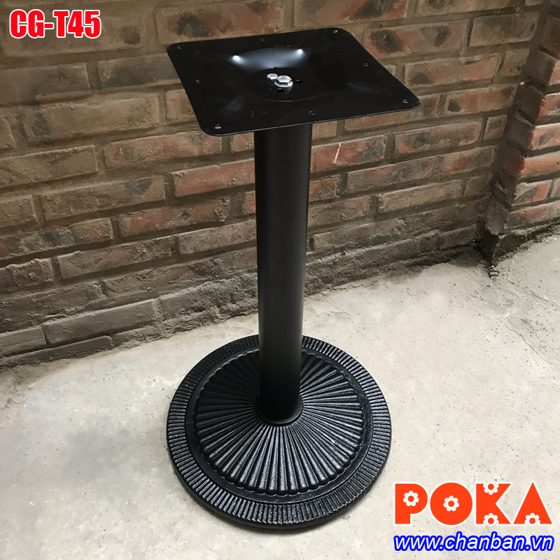 Chân bàn gang đúc đế tròn 45cm được sơn màu đen với họa tiết bên dưới là điểm nhấn của chiếc bàn. Phần đế bên dưới bằng gang đúc nguyên khối làm tăng độ vững chắc cho chiếc bàn, phần bên trên là mặt bích hình vuông có sẵn lỗ để khoan bắt vít vào mặt bàn.