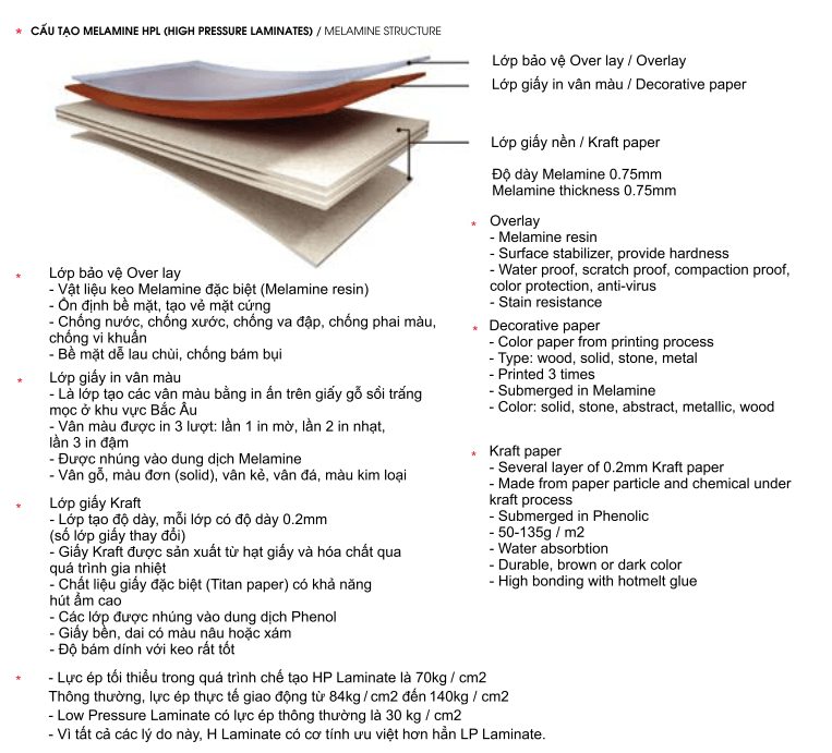 Bề mặt Laminate là bề mặt nhựa tổng hợp tương tự như Melamine, nhưng dày hơn Melamine nhiều. Độ dày của laminate là 0.5-1mm tùy từng loại ( có thể phần biệt laminate và Melamine qua độ dày), tuy nhiên laminate thông thường vẫn sử dụng có độ dày là 0.7 hoặc 0.8mm. Cũng như MFC, Laminate chủ yếu được phủ lên các cốt gỗ Ván dán (Okal), Ván mịn (MDF). Ngoài ra Laminate còn có thể dán vào gỗ uốn cong theo công nghệ postforming, tạo nên những đường cong mềm mại duyên dáng.